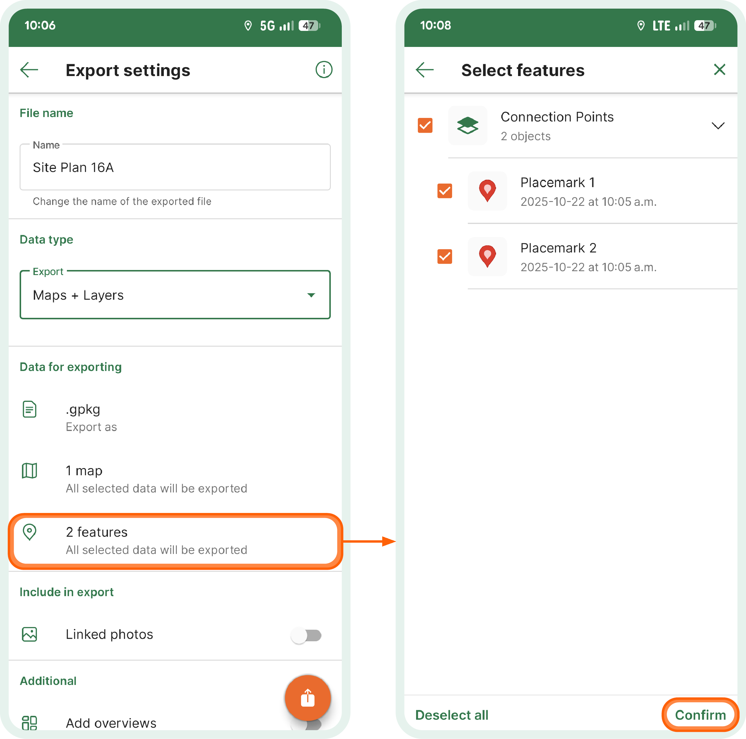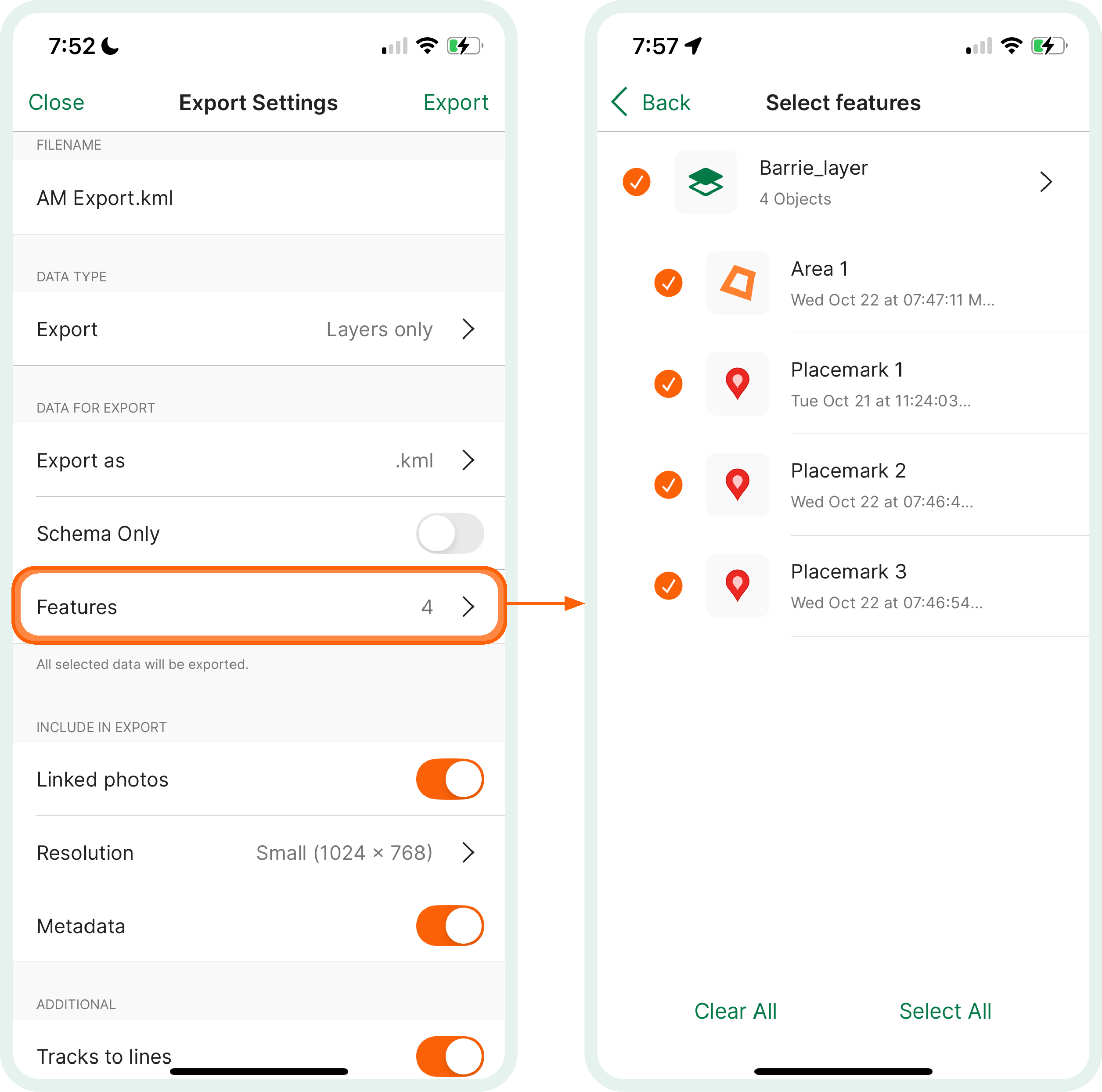Under the ‘Data for Export’ section, tap on ‘Features’ to select all features associated with the current map or to make a custom selection.