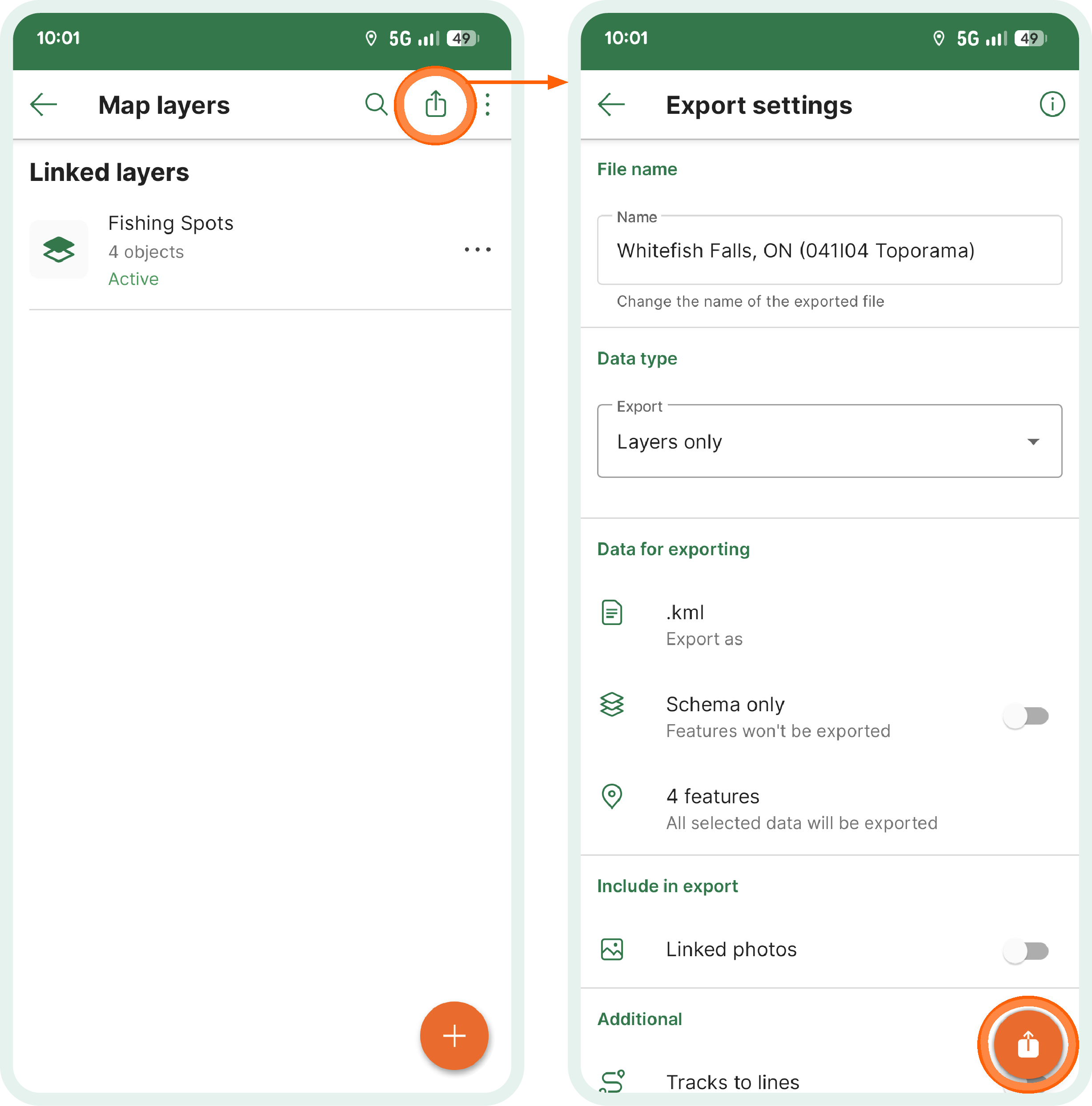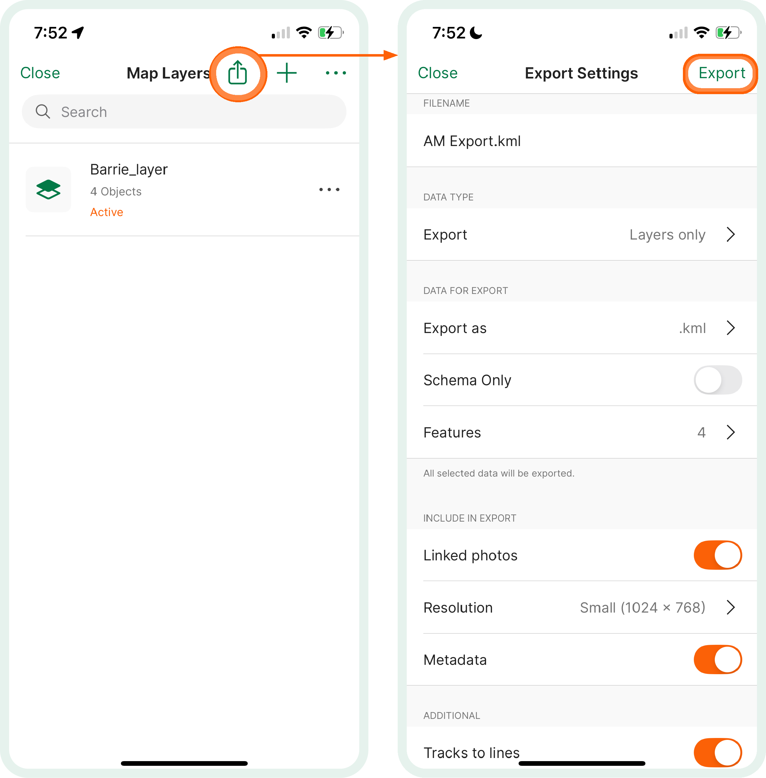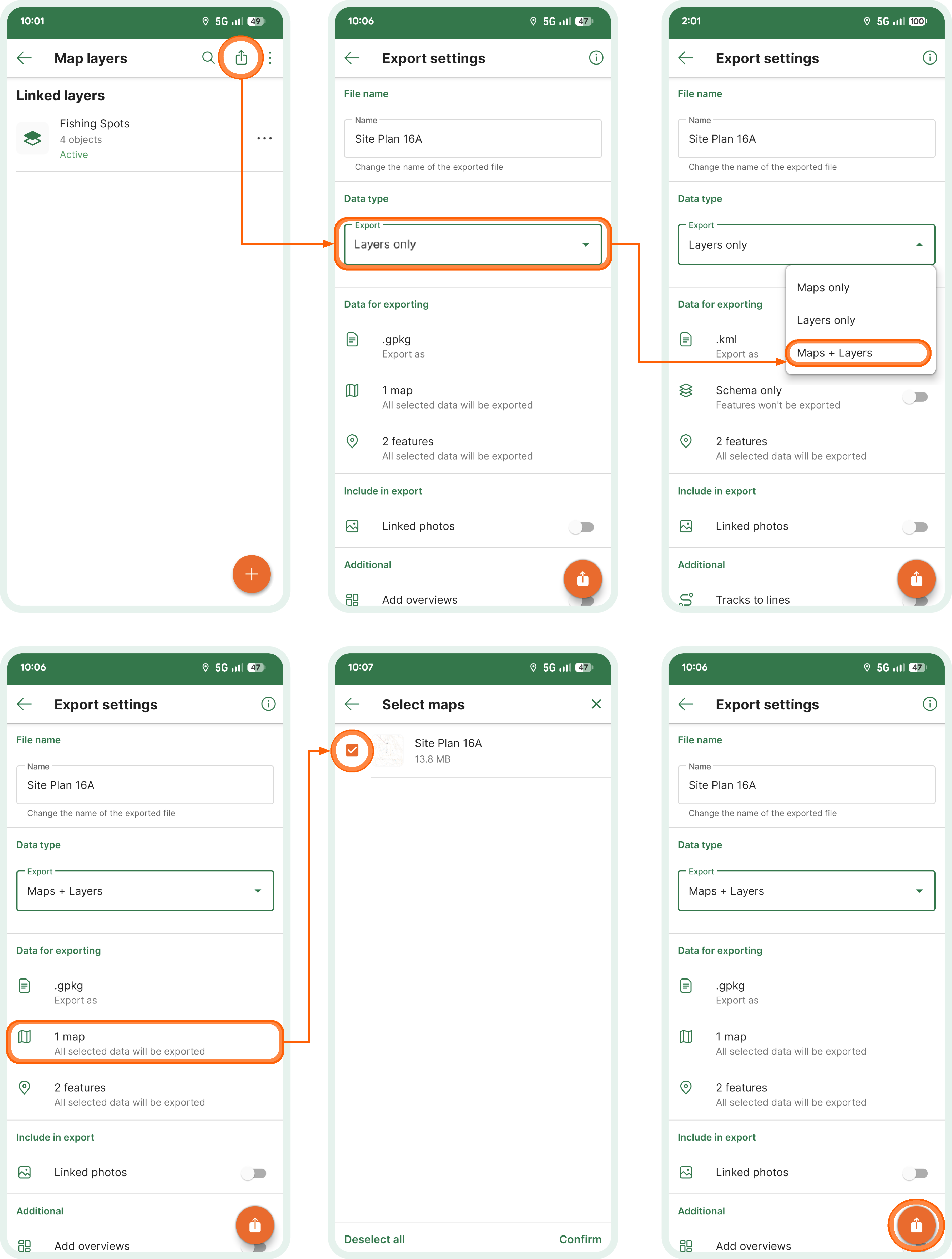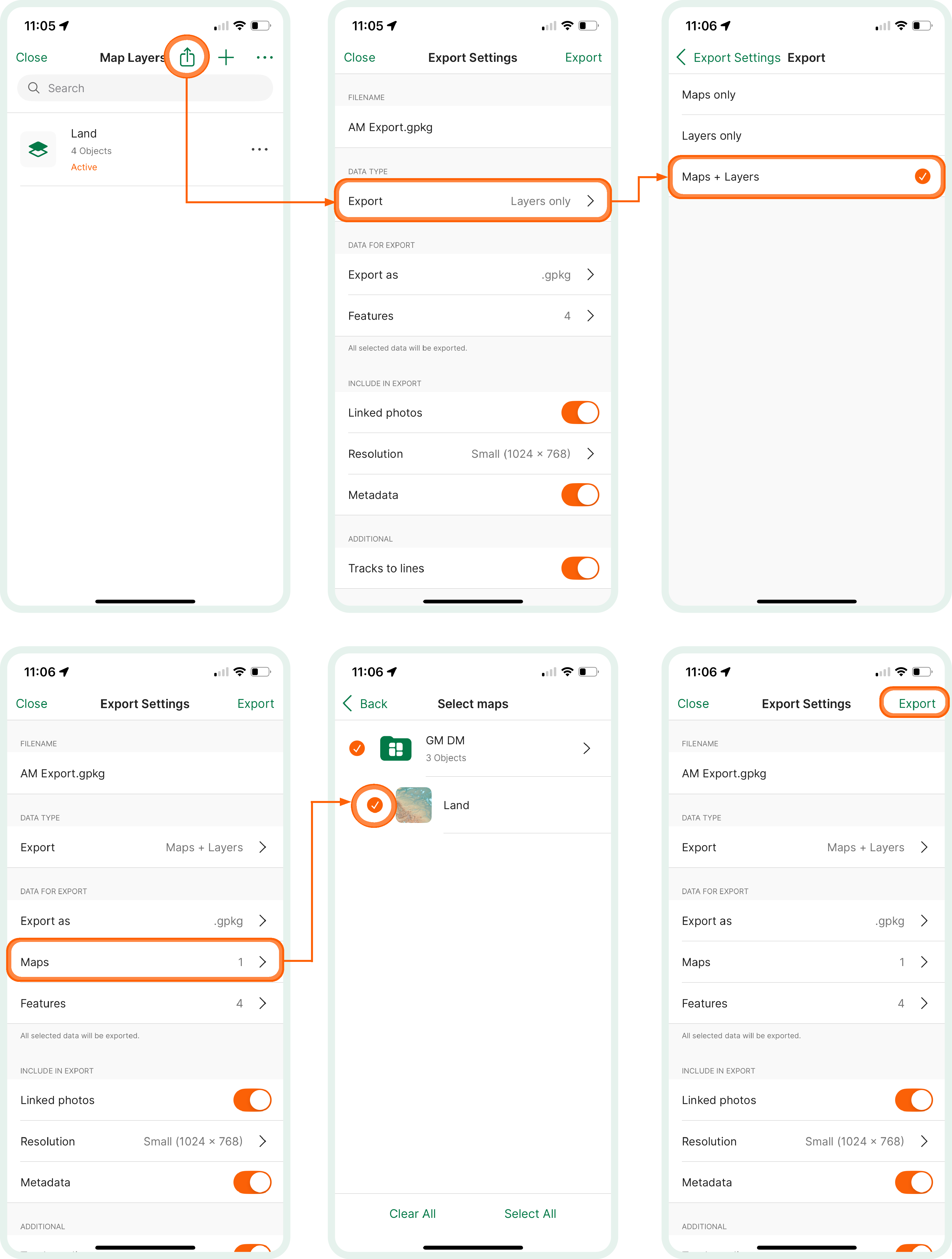 - To export a custom map and its layers, tap ‘Export’ under the ‘Data Type’ section, then select ‘Maps + Layers’. The export format will automatically be set to GeoPackage*.